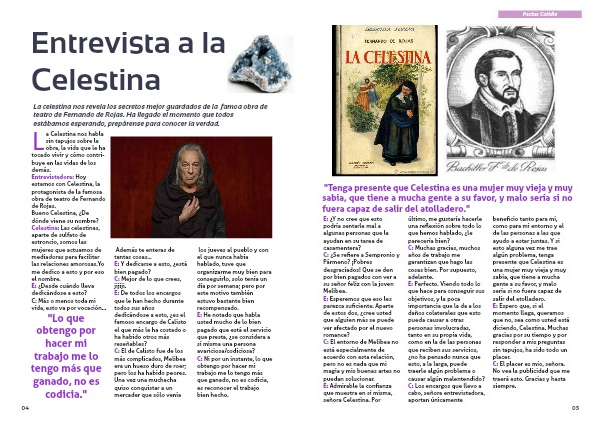 C: Los encargos que llevo a cabo, señora entrevistadora, aportan únicamente beneficio tanto para mi, como para mi entorno y el de las personas a las que ayudo a estar juntas. Y si esto alguna vez me trae algún problema, tenga presente que Celestina es una mujer muy vieja y muy sabia, que tiene a mucha gente a su favor, y malo sería si no fuera capaz de salir del atolladero.
