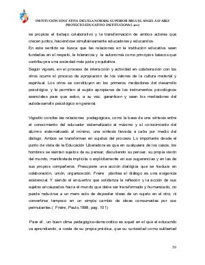 se propicia el trabajo colaborativo y la transformación de ambos actores que crecen juntos, haciéndose simultáneamente educadores y educandos. En este sentido se busca que las relaciones en la institución educativa sean fundadas en el respeto, la tolerancia y la autonomía como principios básicos que contribuye a una sociedad más justa y equitativa. Según vigoski, en el proceso de interacción y actividad en colaboración con los otros ocurre el proceso de apropiación de los valores de la cultura material y espiritual. Los otros se constituyen en los primeros mediadores del desarrollo psicológico y le permiten al sujeto apropiarse de los instrumentos psicológicos esenciales para que estos, a su vez, garanticen y sean los mediadores del autodesarrollo psicológico en general.