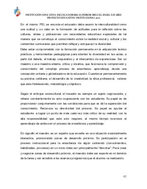 En el mismo PEI, se enuncia el educador debe asumir la interculturalidad como una actitud y un valor en la formación de actitudes para la reflexión sobre las culturas, etnias y poblaciones con necesidades educativas especiales de tal manera que se construya el conocimiento sobre la realidad social y cultural y los contenidos curriculares que permiten reflejar y enriquecer la diversidad. Debe estar comprometido con la formación permanente en la adquisición teórico prácticos y herramientas pedagógicas para abordar la diversidad en las aulas, a partir del debate, el trabajo cooperativo y el intercambio de experiencias. Ser un maestro o una maestra abierta, crítica y creativa, que favorezca la comprensión y conocimiento del complejo proceso de enseñanza- aprendizaje, desde una concepción unitaria y globalizadora de la educación. Cuestionar permanentemente su práctica cotidiana, el desarrollo de la creatividad, la ética profesional, valores que esta fortaleciendo, metodología y objetivos.