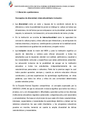 INSTITUCIÓN EDUCATIVA ESCUELA NORMAL SUPERIOR MIGUEL ÁNGEL ÁLVAREZ PROYECTO EDUCATIVO INSTITUCIONAL 2017 1.6 Atención a poblaciones Conceptos de diversidad, interculturalidad e inclusión: • La diversidad como un valor y riqueza de la condición natural de la diferencia y como la posibilidad de poner en diálogo la cultura en todas sus dimensiones, de tal forma que se enriquezca con la pluralidad, partiendo del respeto, la valoración, la interacción y el reconocimiento de todos y todas. • En la institución se concibe la interculturalidad como la capacidad de conocer la cultura propia y otras culturas que interactúan y se enriquecen de manera dinámica y recíproca, contribuyendo a plasmar en la realidad social, una coexistencia en igualdad de condiciones y respeto mutuo. • La inclusión desde la visión del MEN y para la institución significa un asunto de derechos y valores para ofrecer educación a todos los estudiantes que la requieran, atender con calidad, pertinencia y equidad a las necesidades comunes y específicas que estas poblaciones presentan. La educación inclusiva da la posibilidad de acoger en la institución educativa a todos los estudiantes, independientemente de sus características personales o culturales. Parte de la premisa según la cual todos pueden aprender, siempre y cuando su entorno educativo ofrezca condiciones y provea experiencias de aprendizaje significativas; en otras palabras, que todos los niños y niñas de una comunidad determinada puedan estudiar juntos. En la Escuela Normal Superior compartimos el concepto expresado por la UNESCO (1994) de que la educación inclusiva significa que todos los niños y jóvenes, con y sin discapacidad o dificultades, aprenden juntos en las diversas instituciones educativas regulares (preescolar, colegio/escuela, post secundaria y universidades). Se basa en el principio de que cada niño tiene características, intereses, capacidades y necesidades de aprendizaje distintos y deben ser los sistemas educativos los que están diseñados, y los programas educativos puestos en marcha, teniendo en cuenta la amplia diversidad de dichas características y necesidades.