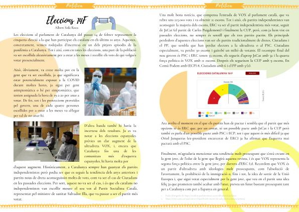 la gent jove , de l ’ edat de la gent que llegirà aquesta revista , i és que VOX representa la segona força política entre la gent jove , per darrera d ’ ERC ( 2 ). Recordem que VOX és un partit d ’ ultradreta amb ideologies molt preocupants , com l ’ absolució de l ’ avortament , la prohibició de la immigració o , fins i tot , la idea de sortir de la Unió Europea i , que sigui votat especialment per la gent jove , que veu en el partit una idea feliç ja que prometen també acabar amb l ’ atur , preveu un futur bastant preocupant tant per a Catalunya com per a Espanya en general .