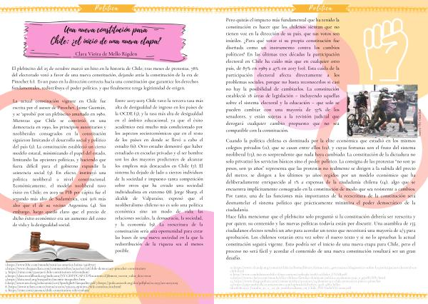 Cuando la política chilena es dominada por la elite económica que estudió en los mismos colegios privados ( 11 ), que se casan entre ellos ( 12 ), y cuyas fortunas son el fruto del sistema neoliberal ( 13 ), no es sorprendente que nada haya cambiado . La constitución de la dictadura no solo privatizó los servicios básicos sino el poder político . La consigna de las protestas “ no son 30 pesos , son 30 años ” representa que las protestas no realmente se dirigen a la subida del precio del metro ; se dirigen a los últimos 30 años regidos por un modelo económico que ha deliberadamente enriquecido al 1 % a expensas de la ciudadanía chilena ( 14 ), algo que se encuentra implícitamente consagrado en la constitución de modo que sea resistente a cambios . Por tanto , una de las funciones más importantes de la reescritura de la constitución será desmantelar el sistema político que prácticamente minimiza el poder democrático de la ciudadanía . Hace falta mencionar que el plebiscito solo preguntó si la constitución debería ser reescrita y por quien ; su contenido y las nuevas políticas todavía están por discutir . Una asamblea de 155 ciudadanos electos tendrá un año para acordar un texto que necesitará una mayoría de 2 / 3 para aprobación . Los chilenos votarán otra vez sobre el nuevo texto y si no lo aprueban la actual constitución seguirá vigente . Esto podría ser el inicio de una nueva etapa para Chile , pero el proceso no será fácil y acordar el contenido de una nueva constitución resultará ser un gran desafío .