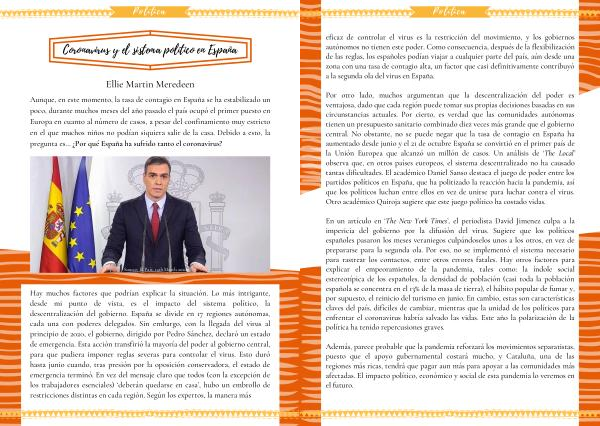 En un artículo en ‘ The New York Times ’, el periodista David Jimenez culpa a la impericia del gobierno por la difusión del virus . Sugiere que los políticos españoles pasaron los meses veraniegos culpándoselos unos a los otros , en vez de prepararse para la segunda ola . Por eso , no se implementó el sistema necesario para rastrear los contactos , entre otros errores fatales . Hay otros factores para explicar el empeoramiento de la pandemia , tales como : la índole social estereotípica de los españoles , la densidad de población ( casi toda la población española se concentra en el 13 % de la masa de tierra ), el hábito popular de fumar y , por supuesto , el reinicio del turismo en junio . En cambio , estas son características claves del país , difíciles de cambiar , mientras que la unidad de los políticos para enfrentar el coronavirus habría salvado las vidas . Este año la polarización de la política ha tenido repercusiones graves .