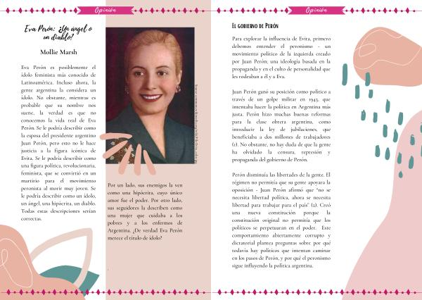 Eva Perón es posiblemente el ídolo feminista más conocido de Latinoamérica . Incluso ahora , la gente argentina la considera un ídolo . No obstante , mientras es probable que su nombre nos suene , la verdad es que no conocemos la vida real de Eva Perón . Se le podría describir como la esposa del presidente argentino Juan Perón , pero esto no le hace justicia a la figura icónica de Evita . Se le podría describir como una figura política , revolucionaria , feminista , que se convirtió en un martirio para el movimiento peronista al morir muy joven . Se le podría describir como un ídolo , un ángel , una hipócrita , un diablo . Todas estas descripciones serían correctas .