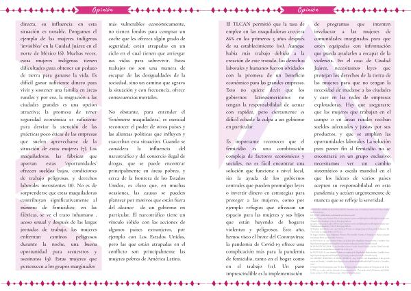 ( 5 ) Stephen , Lynn Marie , 2020 . Latin American Women are disappearing and dying under lockdown , The Conversation , 24 August , Politics and Society . ( 6 ) Eagan , Madison , 2020 , Indigenous Women : The Invisible Victims of Femicide in Mexico , Harvard International Review , 30 November , Americas . ( 7 ) PANTALEO , K . 2010 Gendered Violence , an analysis of the Maquiladora Murders [ online ]. Available from https :// journals . sagepub . com / doi / pdf / 10.1177 / 1057567710380914 [ accessed 9 December 2020 ]. ( 8 ) LIVINGSTONE , JESSICA ., 2004 Murder in Juarez : Gender , Sexual Violence , and the Global Assembly Line . Frontiers , A Journal of Women Studies , Vol . 25 ( 1 ), 59-76 . ( 9 ) PANTALEO , K . 2010 Gendered Violence , an analysis of the Maquiladora Murders [ online ]. Available from https :// journals . sagepub . com / doi / pdf / 10.1177 / 1057567710380914 [ accessed 9 December 2020 ]. ( 10 ) GRUBEN , WILLIAM . C , & KISER , SHERRY . L ., 2001 , NAFTA and Maquiladoras , is the growth connected ? [ online ]. Available from https :// core . ac . uk / download / pdf / 6568288 . pdf [ accessed 9 December 2020 ] ( 11 ) López , Maria Encarnación , 2020 , The lives of Mexico ’ s Maquiladora workers are being put at risk by lax COVID-19- 19 rules and the demands of international trade . The London school of Economics and Political Science 25 May , COVID-19 | Mexico under AMLO | Political Economy
