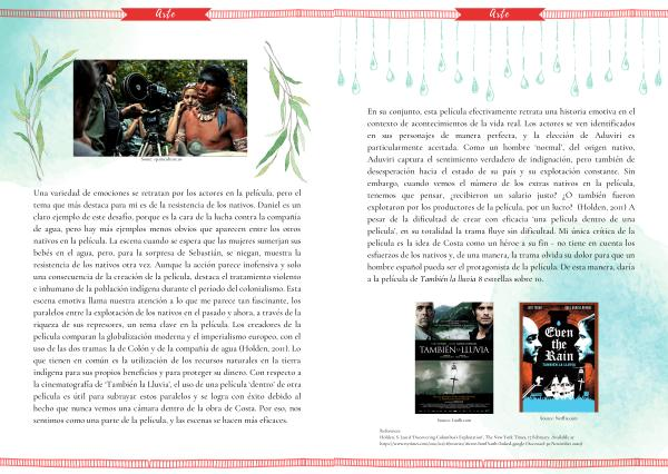 En su conjunto , esta película efectivamente retrata una historia emotiva en el contexto de acontecimientos de la vida real . Los actores se ven identificados en sus personajes de manera perfecta , y la elección de Aduviri es particularmente acertada . Como un hombre ‘ normal ’, del origen nativo , Aduviri captura el sentimiento verdadero de indignación , pero también de desesperación hacia el estado de su país y su explotación constante . Sin embargo , cuando vemos el número de los extras nativos en la película , tenemos que pensar , ¿ recibieron un salario justo ? ¿ O también fueron explotaron por los productores de la película , por un lucro ? ( Holden , 2011 ) A pesar de la dificultad de crear con eficacia ‘ una película dentro de una película ’, en su totalidad la trama fluye sin dificultad . Mi única crítica de la película es la idea de Costa como un héroe a su fin - no tiene en cuenta los esfuerzos de los nativos y , de una manera , la trama olvida su dolor para que un hombre español pueda ser el protagonista de la película . De esta manera , daría a la película de También la lluvia 8 estrellas sobre 10 .