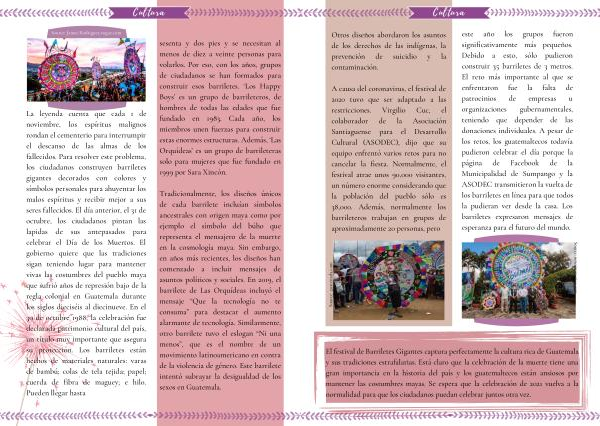 Tradicionalmente , los diseños únicos de cada barrilete incluían símbolos ancestrales con origen maya como por ejemplo el símbolo del búho que representa el mensajero de la muerte en la cosmología maya . Sin embargo , en años más recientes , los diseños han comenzado a incluir mensajes de asuntos políticos y sociales . En 2019 , el barrilete de Las Orquídeas incluyó el mensaje “ Que la tecnología no te consuma ” para destacar el aumento alarmante de tecnología . Similarmente , otro barrilete tuvo el eslogan “ Ni una menos ”, que es el nombre de un movimiento latinoamericano en contra de la violencia de género . Este barrilete intentó subrayar la desigualdad de los sexos en Guatemala .