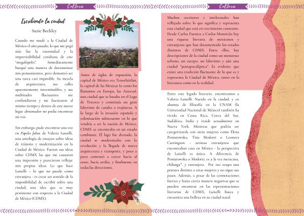 Entre este legado literario , encontramos a Valeria Luiselli . Nacida en la ciudad , y ex alumna de filosofía en la UNAM ( la Universidad Nacional de México ) también ha vivido en Costa Rica , Corea del Sur , Sudáfrica , India y reside actualmente en Nueva York . Mientras que podría ser categorizarda con otras mujeres como Elena Poniatowska , Tina Modotti o Leonora Carrington - artistas extranjeros que encontraban casa en México - la perspectiva de Luiselli es única . A diferencia de Poniatowska o Modotti , es a la vez mexicana , chilanga *, y extranjera . Por eso ocupa una postura distinta a estas mujeres y no sigue sus pasos . Además , a pesar de las connotaciones fuertes y hasta cierta manera negativas que se pueden encontrar en las representaciones literarias de CDMX , Luiselli busca y encuentra una belleza en su ciudad natal .
