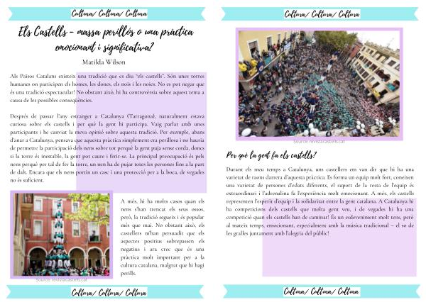 Durant els meu temps a Catalunya , uns castellers em van dir que hi ha una varietat de raons darrera d ’ aquesta pràctica . Es forma un equip molt fort , coneixen una varietat de persones d ’ edats diferents , el suport de la resta de l ’ equip és extraordinari i l ’ adrenalina fa l ’ experiència molt emocionant . A més , els castells representen l ’ esperit d ’ equip i la solidaritat entre la gent catalana . A Catalunya hi ha competicions dels castells que molta gent veu , i de vegades hi ha una competició quan els castells han de caminar ! És un esdeveniment molt tens , però al mateix temps , emocionant , especialment amb la música tradicional – el so de les gralles juntament amb l ’ alegria del públic !