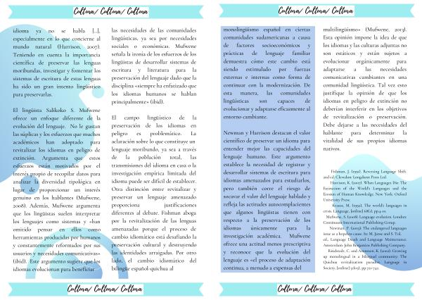 El campo lingüístico de la preservación de los idiomas en peligro es problemático . La aclaración sobre lo que constituye un lenguaje moribundo , ya sea a través de la población total , las transmisiones del idioma en casa o la investigación empírica limitada del idioma puede ser difícil de establecer . Otra distinción entre revitalizar y preservar un lenguaje amenazado proporciona justificaciones diferentes al debate . Fishman aboga por la revitalización de las lenguas amenazadas porque el proceso de cambio idiomático está desafiando la preservación cultural y destruyendo las identidades arraigadas . Por otro lado , el cambio idiomático del bilingüe español-quichua al