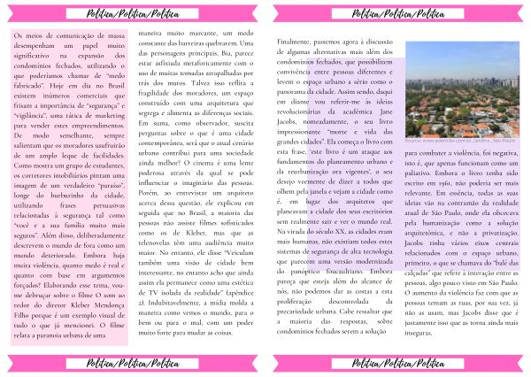 Os meios de comunicação de massa desempenham um papel muito significativo na expansão dos condomínios fechados , utilizando o que poderíamos chamar de “ medo fabricado ”. Hoje em dia no Brasil existem inúmeros comerciais que frisam a importância de “ segurança ” e “ vigilância ”, uma tática de marketing para vender estes empreendimentos . De modo semelhante , sempre salientam que os moradores usufruirão de um amplo leque de facilidades . Como mostra um grupo de estudantes , os corretores imobiliários pintam uma imagem de um verdadeiro “ paraíso ”, longe do burburinho da cidade , utilizando frases persuasivas relacionadas à segurança tal como “ você e a sua família muito mais seguros ”. Além disso , deliberadamente descrevem o mundo de fora como um mundo deteriorado . Embora haja muita violência , quanto medo é real e quanto com base em argumentos forçados ? Elaborando esse tema , voume debruçar sobre o filme O som ao redor do diretor Kleber Mendonça Filho porque é um exemplo visual de tudo o que já mencionei . O filme relata a paranoia urbana de uma maneira muito marcante , um medo constante das barreiras quebrarem . Uma das personagens principais , Bia , parece estar asfixiada metaforicamente com o uso de muitas tomadas atrapalhadas por trás dos muros . Talvez isso reflita a fragilidade dos moradores , um espaço construído com uma arquitetura que segrega e alimenta as diferenças sociais . Em suma , como observador , suscita perguntas sobre o que é uma cidade contemporânea , será que o atual cenário urbano contribui para uma sociedade ainda melhor ? O cinema é uma lente poderosa através da qual se pode influenciar o imaginário das pessoas . Porém , ao entrevistar um arquiteto acerca dessa questão , ele explicou em seguida que no Brasil , a maioria das pessoas não assiste filmes sofisticados como os de Kleber , mas que as telenovelas têm uma audiência muito maior . No entanto , ele disse “ Veiculam também uma visão de cidade bem interessante , no entanto acho que ainda assim ela permanece como uma estética de TV isolada da realidade ” ( apêndice 2 ). Indubitavelmente , a mídia molda a maneira como vemos o mundo , para o bem ou para o mal , com um poder muito forte para mudar as coisas .