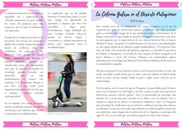 En Secundaria , me di cuenta de que en Patagonia , los que hablan galés lo hacen junto con el español en vez del inglés , y me dio a pensar en qué otros aspectos se diferencian nuestras culturas ‘ galesas ’. Tuve la oportunidad de investigar más durante los 6 meses que pasé viviendo en La Plata , cerca de Buenos Aires y aunque el origen de mi interés era puramente lingüístico , viajé a la Patagonia para investigar las condiciones que permiten la confluencia de estas dos culturas tan distintas . Lo que me interesaba especialmente era cómo los galeses mantenían sus tradiciones , justo después de la unificación de la Argentina a principios del siglo XX . Es casi increíble que una colonia pequeña de cuatro mil creyentes