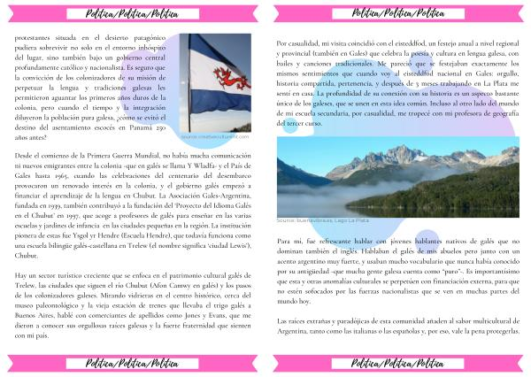 Para mí , fue refrescante hablar con jóvenes hablantes nativos de galés que no dominan también el inglés . Hablaban el galés de mis abuelos pero junto con un acento argentino muy fuerte , y usaban mucho vocabulario que nunca había conocido por su antigüedad -que mucha gente galesa cuenta como “ puro ” - . Es importantísimo que esta y otras anomalías culturales se perpetúen con financiación externa , para que no estén sofocados por las fuerzas nacionalistas que se ven en muchas partes del mundo hoy .