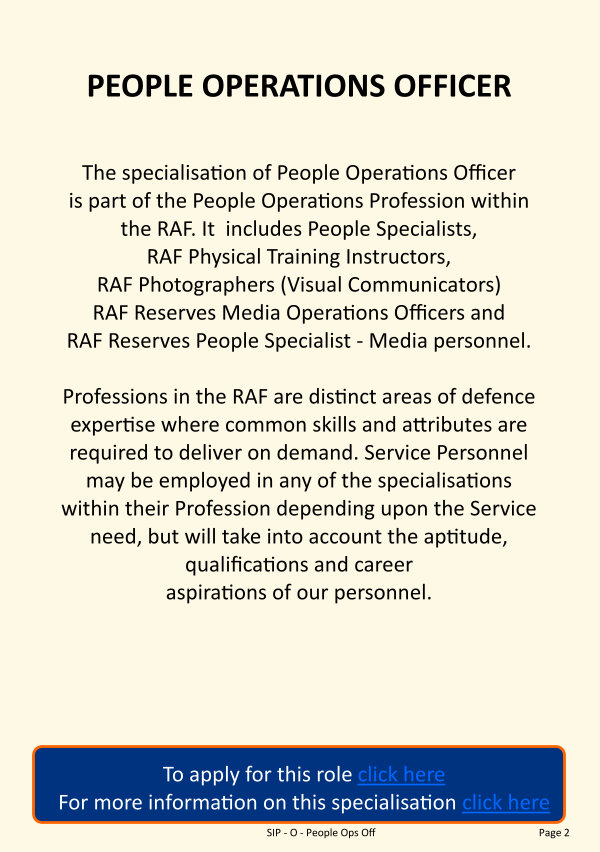 The specialisation of People Operations Officer is part of the People Operations Profession within the RAF. It includes People Specialists, RAF Physical Training Instructors, RAF Photographers( Visual Communicators) RAF Reserves Media Operations Officers and RAF Reserves People Specialist- Media personnel.