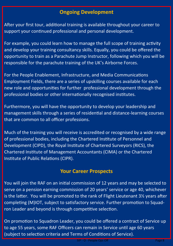 Furthermore, you will have the opportunity to develop your leadership and management skills through a series of residential and distance-learning courses that are common to all officer professions.