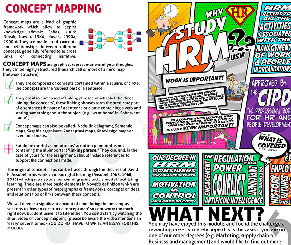 We will devote a significant amount of time during the on-campus sessions to 'how to construct a concept map' so dont worry too much right now, but dont leave it to late either. You could start by watching the short video on concept mapping (please be aware the video mentions an 'essay' several times - YOU DO NOT HAVE TO WRITE AN ESSAY FOR THIS MODULE.