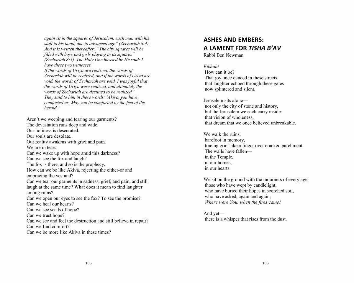 Aren’ t we weeping and tearing our garments? The devastation runs deep and wide. Our holiness is desecrated. Our souls are desolate. Our reality awakens with grief and pain. We are in tears. Can we wake up with hope amid this darkness? Can we see the fox and laugh? The fox is there, and so is the prophecy. How can we be like Akiva, rejecting the either-or and embracing the yes-and? Can we tear our garments in sadness, grief, and pain, and still laugh at the same time? What does it mean to find laughter among ruins? Can we open our eyes to see the fox? To see the promise? Can we heal our hearts? Can we see seeds of hope? Can we trust hope? Can we see and feel the destruction and still believe in repair? Can we find comfort? Can we be more like Akiva in these times?