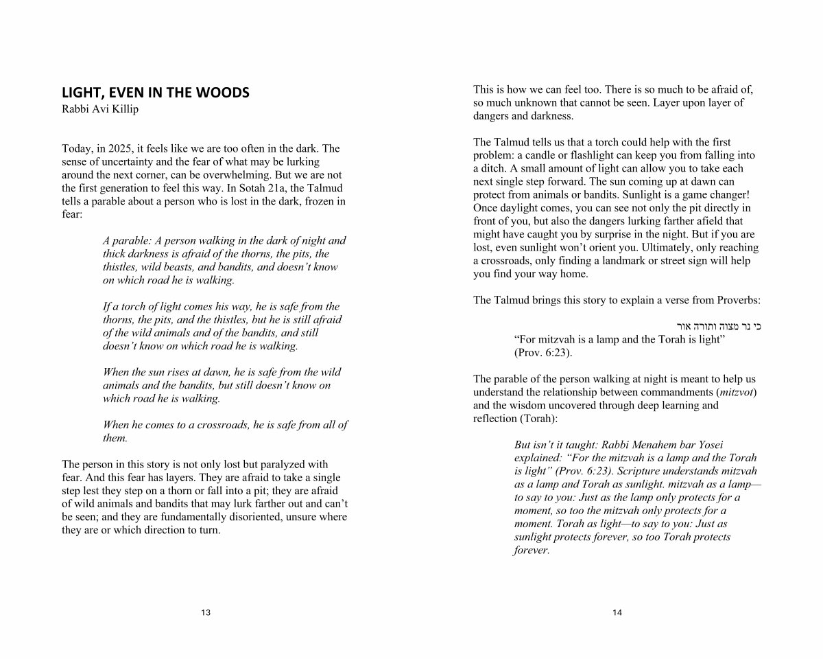 The Talmud tells us that a torch could help with the first problem: a candle or flashlight can keep you from falling into a ditch. A small amount of light can allow you to take each next single step forward. The sun coming up at dawn can protect from animals or bandits. Sunlight is a game changer! Once daylight comes, you can see not only the pit directly in front of you, but also the dangers lurking farther afield that might have caught you by surprise in the night. But if you are lost, even sunlight won’ t orient you. Ultimately, only reaching a crossroads, only finding a landmark or street sign will help you find your way home.