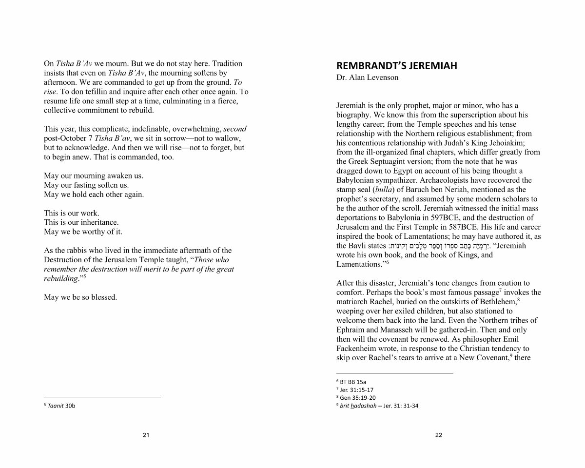After this disaster, Jeremiah’ s tone changes from caution to comfort. Perhaps the book’ s most famous passage 7 invokes the matriarch Rachel, buried on the outskirts of Bethlehem, 8 weeping over her exiled children, but also stationed to welcome them back into the land. Even the Northern tribes of Ephraim and Manasseh will be gathered-in. Then and only then will the covenant be renewed. As philosopher Emil Fackenheim wrote, in response to the Christian tendency to skip over Rachel’ s tears to arrive at a New Covenant, 9 there