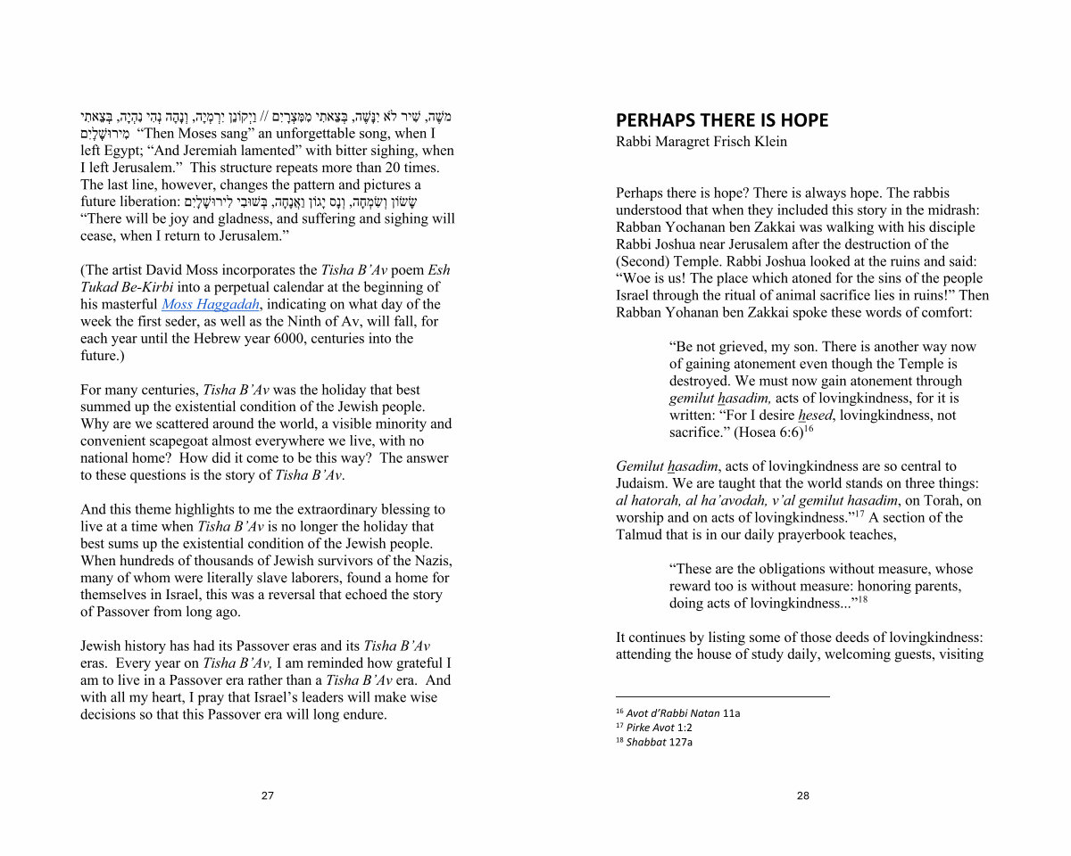 “ Be not grieved, my son. There is another way now of gaining atonement even though the Temple is destroyed. We must now gain atonement through gemilut hasadim, acts of lovingkindness, for it is written:“ For I desire hesed, lovingkindness, not sacrifice.”( Hosea 6:6) 16