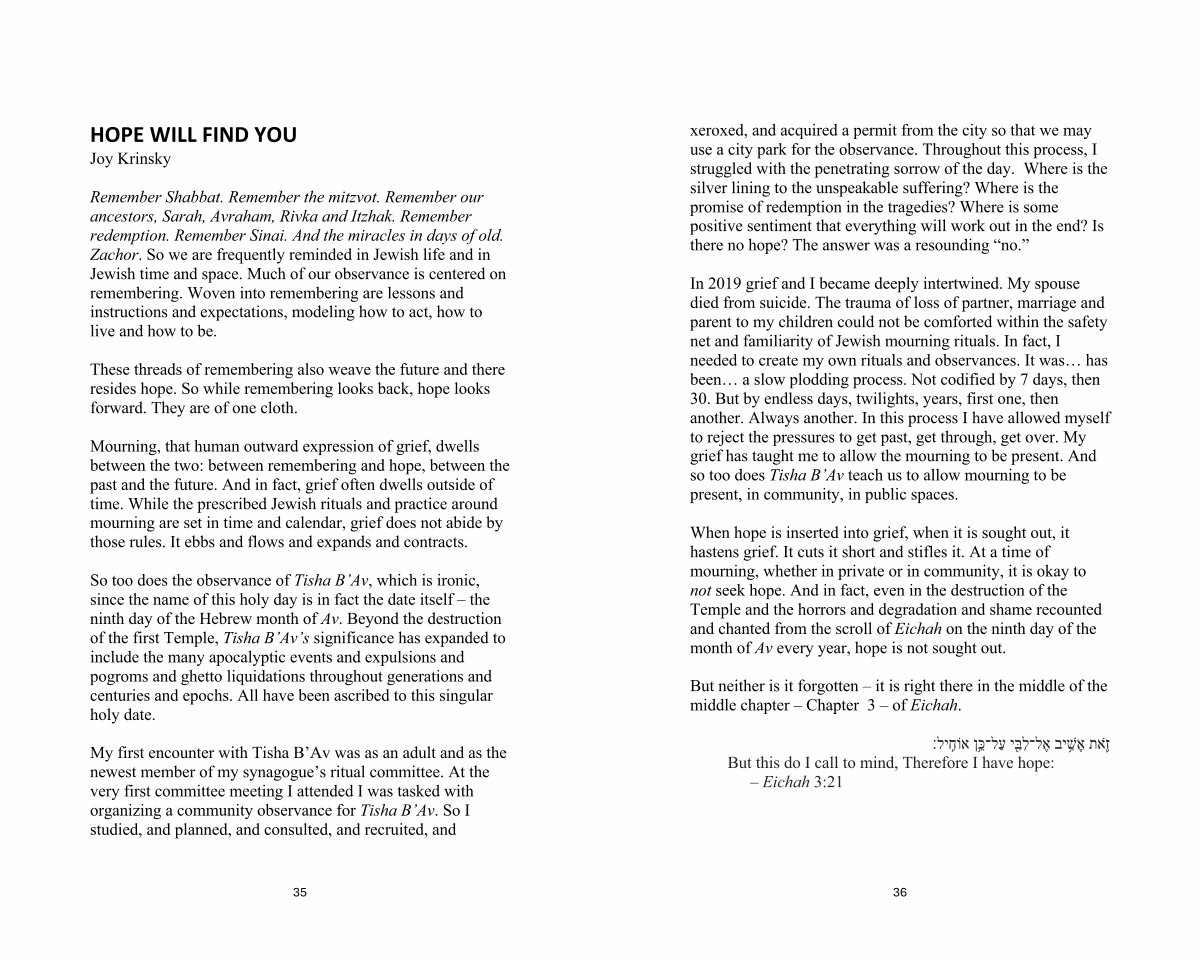 Mourning, that human outward expression of grief, dwells between the two: between remembering and hope, between the past and the future. And in fact, grief often dwells outside of time. While the prescribed Jewish rituals and practice around mourning are set in time and calendar, grief does not abide by those rules. It ebbs and flows and expands and contracts.
