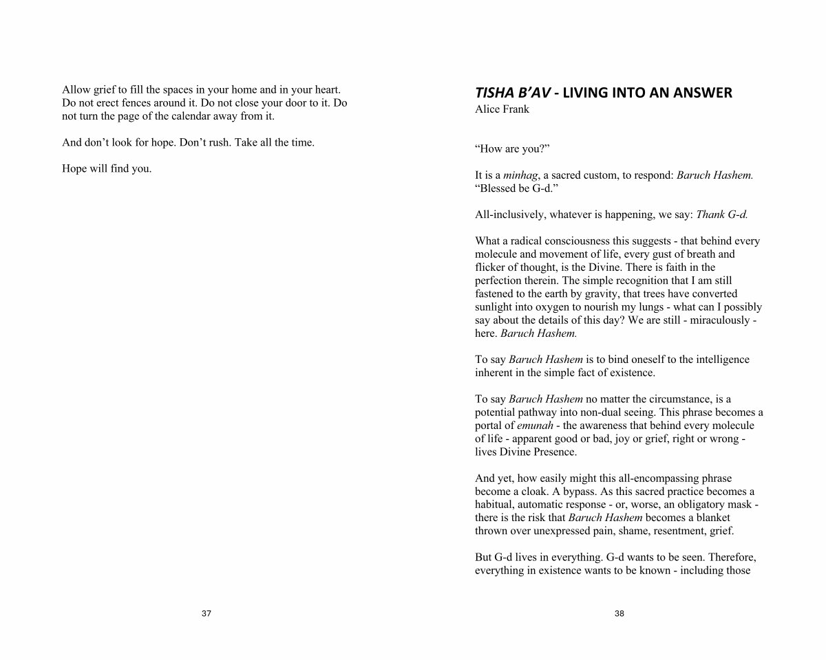 And yet, how easily might this all-encompassing phrase become a cloak. A bypass. As this sacred practice becomes a habitual, automatic response- or, worse, an obligatory mask- there is the risk that Baruch Hashem becomes a blanket thrown over unexpressed pain, shame, resentment, grief.