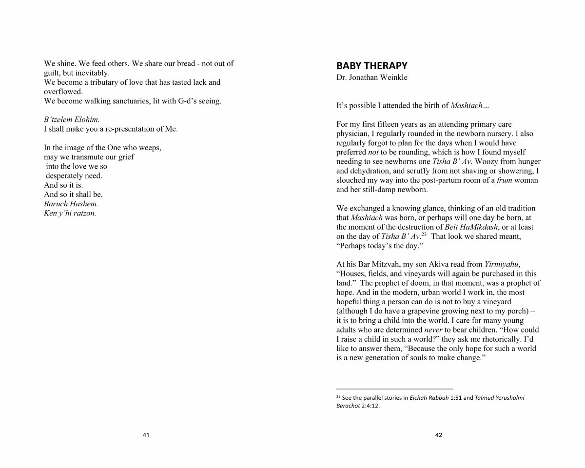 We exchanged a knowing glance, thinking of an old tradition that Mashiach was born, or perhaps will one day be born, at the moment of the destruction of Beit HaMikdash, or at least on the day of Tisha B’ Av. 23 That look we shared meant,“ Perhaps today’ s the day.”