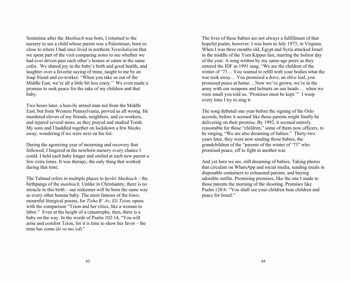 The lives of these babies are not always a fulfillment of that hopeful psalm, however. I was born in July 1973, in Virginia. When I was three months old, Egypt and Syria attacked Israel in the middle of the Yom Kippur fast, marring the holiest day of the year. A song written by my same-age peers as they entered the IDF in 1991 sang,“ We are the children of the winter of’ 73 … You wanted to refill with your bodies what the war took away … You promised a dove, an olive leaf, you promised peace at home … Now we’ ve grown, we’ re in the army with our weapons and helmets on our heads … when we were small you told us,‘ Promises must be kept.’” I weep every time I try to sing it.