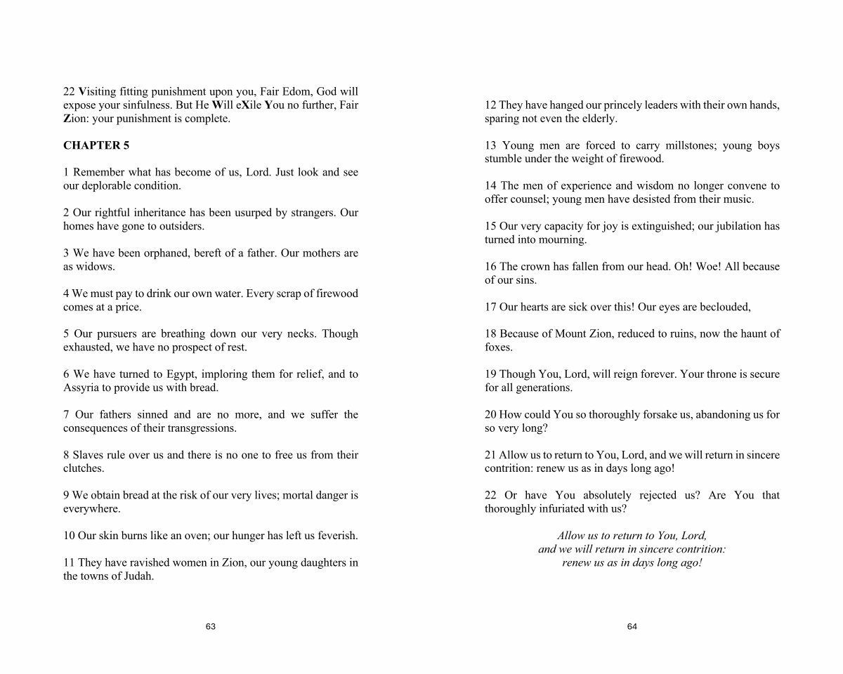 22 Visiting fitting punishment upon you, Fair Edom, God will expose your sinfulness. But He Will eXile You no further, Fair Zion: your punishment is complete.