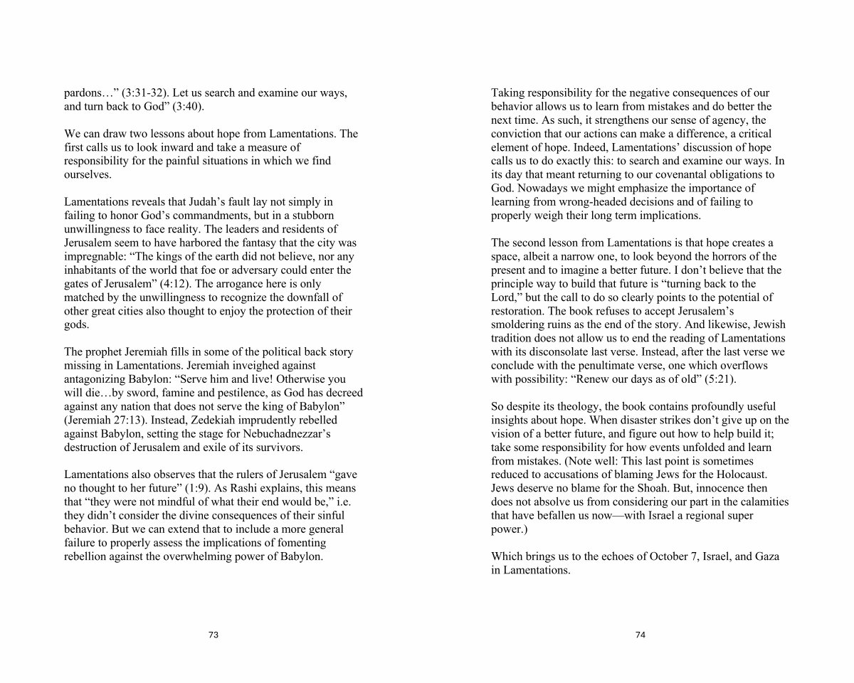 We can draw two lessons about hope from Lamentations. The first calls us to look inward and take a measure of responsibility for the painful situations in which we find ourselves.