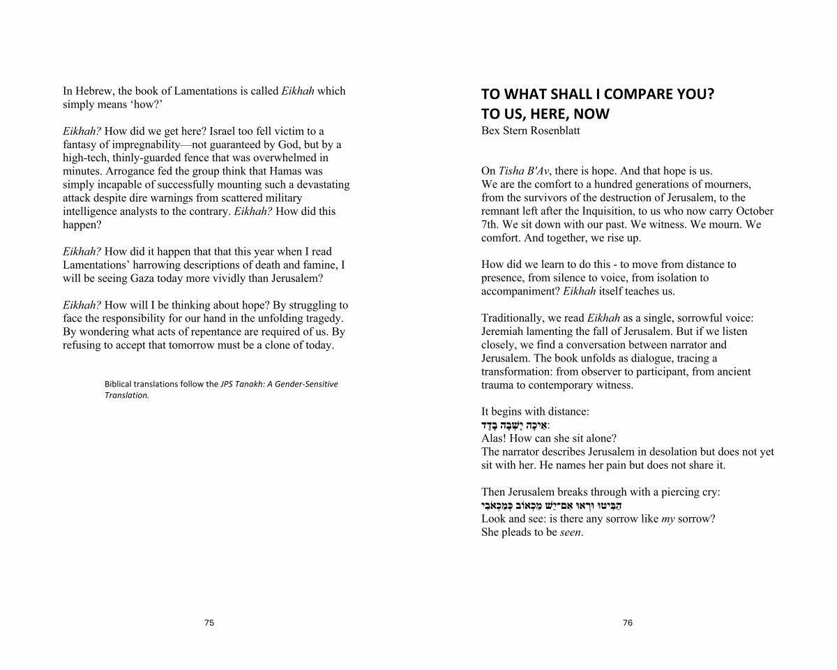 Eikhah? How did it happen that that this year when I read Lamentations’ harrowing descriptions of death and famine, I will be seeing Gaza today more vividly than Jerusalem?