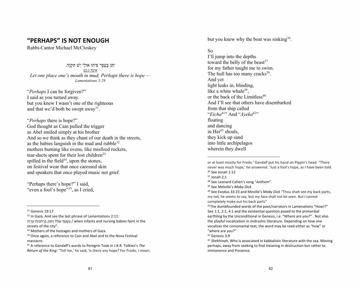 “ Perhaps there is hope?” God thought as Cain pulled the trigger as Abel smiled simply at his brother And so we think as they chant of our death in the streets, as the babies languish in the mud and rubble 32 mothers burning like ovens, like misfired rockets, tear-ducts spent for their lost children 33 spilled in the field 34, upon the stones, on festival wear that once caressed skin and speakers that once played music not grief.