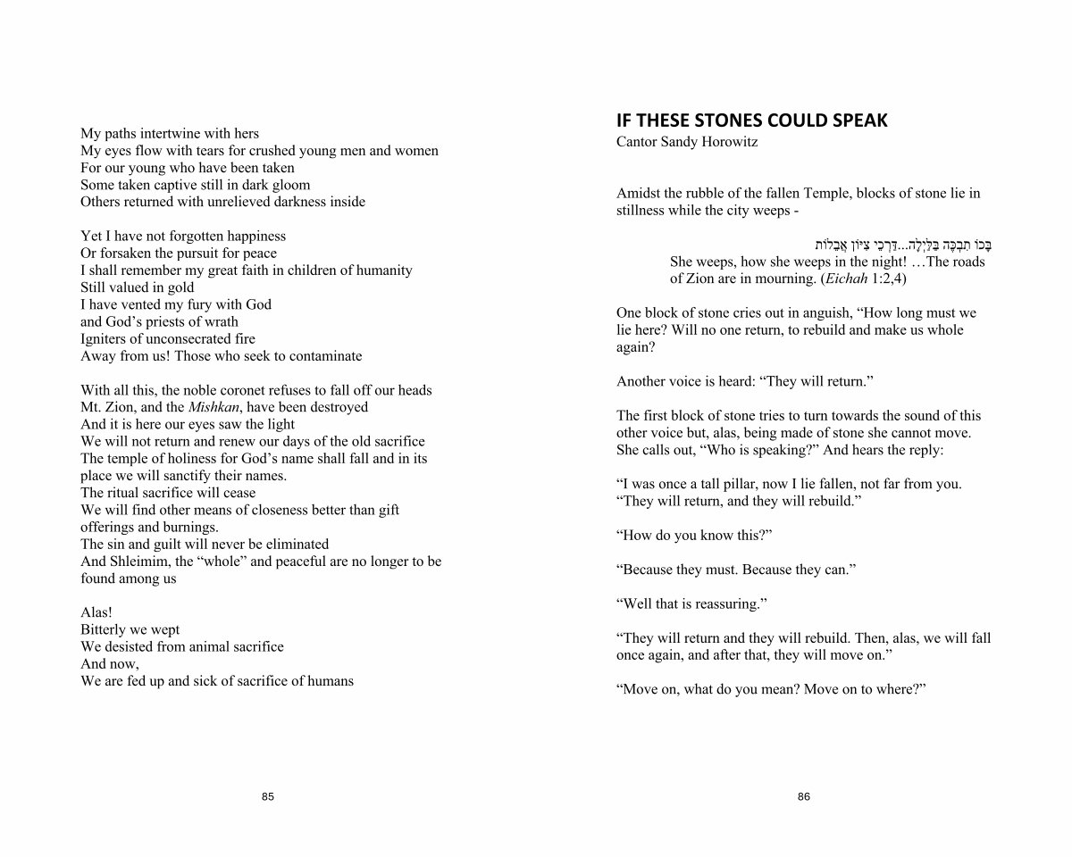 With all this, the noble coronet refuses to fall off our heads Mt. Zion, and the Mishkan, have been destroyed And it is here our eyes saw the light We will not return and renew our days of the old sacrifice The temple of holiness for God’ s name shall fall and in its place we will sanctify their names. The ritual sacrifice will cease We will find other means of closeness better than gift offerings and burnings. The sin and guilt will never be eliminated And Shleimim, the“ whole” and peaceful are no longer to be found among us