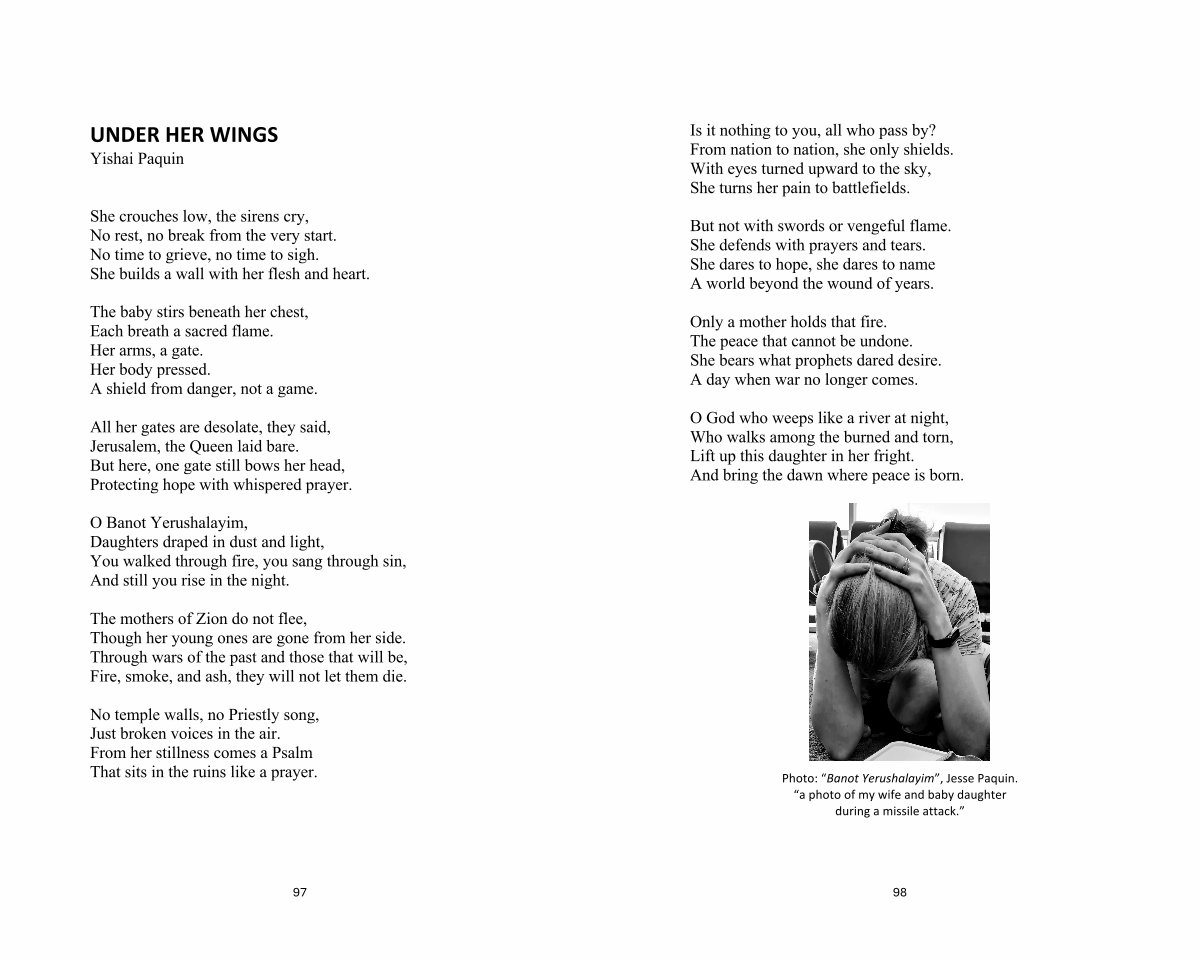 The mothers of Zion do not flee, Though her young ones are gone from her side. Through wars of the past and those that will be, Fire, smoke, and ash, they will not let them die.