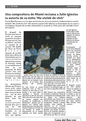 Grecia Mimi Korman a sus 74 sigue en la lucha por el reconocimiento intelectual de la canción titulada “ Me olvidé de vivir” del cantante español Julio Iglesias, la demandante de 74 vuelve a los juzgados después de ya haber demandado al cantante en 1990, juicio del cual falló a favor del español .