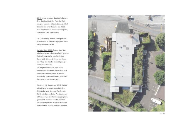 Anfang Juni 2018 : Gegen den Gestaltungsplan „ Sonnenplatz “ gingen keine Einsprache ein . Auch das Land gab grünes Licht , womit nun der Weg für das Baubewilligungsverfahren frei ist . Ab September 2019 befassen sich Student * innen des Advanced Studios Alessi-Capaul mit dem Gebäude , dokumentieren , machen Bestandsaufnahmen , etc .