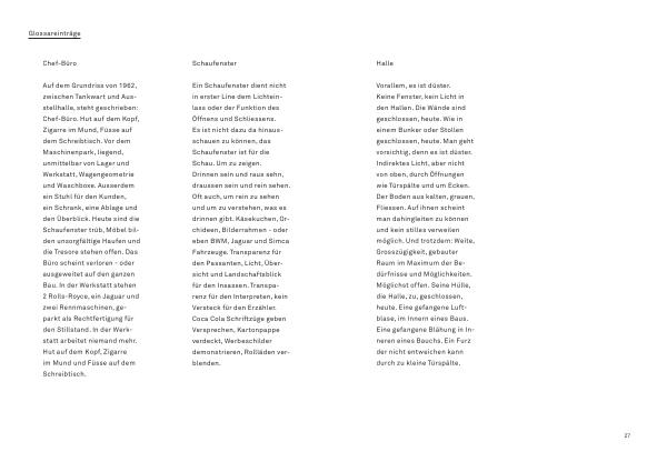 Auf dem Grundriss von 1962 , zwischen Tankwart und Ausstellhalle , steht geschrieben : Chef-Büro . Hut auf dem Kopf , Zigarre im Mund , Füsse auf dem Schreibtisch . Vor dem Maschinenpark , liegend , unmittelbar von Lager und Werkstatt , Wagengeometrie und Waschboxe . Ausserdem ein Stuhl für den Kunden , ein Schrank , eine Ablage und den Überblick . Heute sind die Schaufenster trüb , Möbel bilden unsorgfältige Haufen und die Tresore stehen offen . Das Büro scheint verloren - oder ausgeweitet auf den ganzen Bau . In der Werkstatt stehen 2 Rolls-Royce , ein Jaguar und zwei Rennmaschinen , geparkt als Rechtfertigung für den Stillstand . In der Werkstatt arbeitet niemand mehr . Hut auf dem Kopf , Zigarre im Mund und Füsse auf dem Schreibtisch .