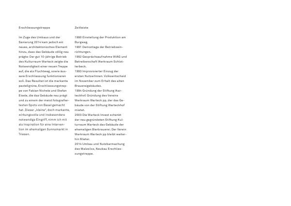 Im Zuge des Umbaus und der Sanierung 2014 kam jedoch ein neues , architektonisches Element hinzu , dass das Gebäude völlig neu prägte : Der gut 10-jährige Betrieb des Kulturraum Warteck zeigte die Notwendigkeit einer neuen Treppe auf , die als Fluchtweg , sowie äussere Erschliessung funktionieren soll . Das Resultat ist die markante pastellgrüne , Erschliessungstreppe von Fabian Nichele und Stefan Eisele , die das Gebäude neu prägt und zu einem der meist fotografiertesten Spots von Basel gemacht hat . Dieser „ kleine “, doch markante , wirkungsvolle und insbesondere notwendige Eingriff , nimm ich mit als Inspiration für eine Intervention im ehemaligen Sunnamarkt in Triesen .