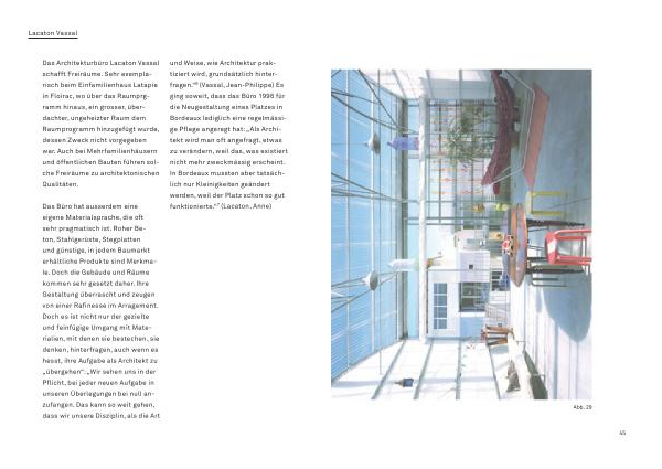 Das Architekturbüro Lacaton Vassal schafft Freiräume . Sehr exemplarisch beim Einfamilienhaus Latapie in Floirac , wo über das Raumprgramm hinaus , ein grosser , überdachter , ungeheizter Raum dem Raumprogramm hinzugefügt wurde , dessen Zweck nicht vorgegeben war . Auch bei Mehrfamilienhäusern und öffentlichen Bauten führen solche Freiräume zu architektonischen Qualitäten .