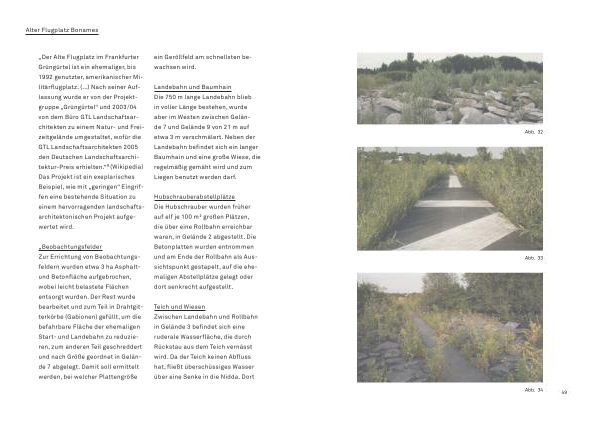 „ Der Alte Flugplatz im Frankfurter Grüngürtel ist ein ehemaliger , bis 1992 genutzter , amerikanischer Militärflugplatz . (...) Nach seiner Auflassung wurde er von der Projektgruppe „ Grüngürtel “ und 2003 / 04 von dem Büro GTL Landschaftsarchitekten zu einem Natur- und Freizeitgelände umgestaltet , wofür die GTL Landschaftsarchitekten 2005 den Deutschen Landschaftsarchitektur-Preis erhielten .“ 9 ( Wikipedia ) Das Projekt ist ein exeplarisches Beispiel , wie mit „ geringen “ Eingriffen eine bestehende Situation zu einem hervorragenden landschaftsarchitektonischen Projekt aufgewertet wird .