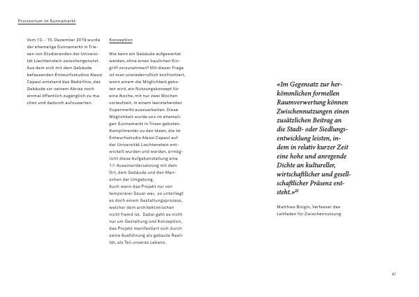 « Im Gegensatz zur herkömmlichen formellen Raumverwertung können Zwischennutzungen einen zusätzlichen Beitrag an die Stadt- oder Siedlungsentwicklung leisten , indem in relativ kurzer Zeit eine hohe und anregende Dichte an kultureller , wirtschaftlicher und gesellschaftlicher Präsenz entsteht .» 21