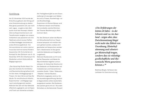 „ Das Upcycling-Studio Alessi-Capaul des Instituts für Architektur und Raumentwicklung befasst sich mit der ehem . Heideggergarage in Triesen . Vor dem Abriss soll das Gebäude für eine Woche als Arbeits- , Experimentier- und Begegnungsraum zwischengenutzt werden . Während der Zeit soll das Gebäude öffentlich zugänglich und mit Speis und Trank zum Verweilen einladen .