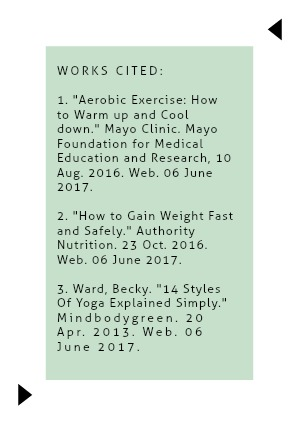 1. "Aerobic Exercise: How to Warm up and Cool down." Mayo Clinic. Mayo Foundation for Medical Education and Research, 10 Aug. 2016. Web. 06 June 2017.