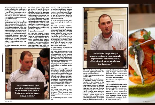 “Restoranlarda engelliler için hizmetlerin olmasını yakın zamanda değerlendirme kriterlerim arasına aldım. Genelde yarım puan bunun için kırıyorum.” F.G: 6 olurdu. Yemek eleştirmenliği yo- lunda doğru adımlar atıyorum ama yap- mam gereken daha çok şey var. P: Türkiye’de tutmayan trendlerden bah- sedebilir misiniz? F.G: Belli bir dönem cupcake furyası var- dı. Yurtdışından özenilip burada herkes açıyordu. Bir diğer tutmayan şey fine dining. Moleküler ve klasik mutfağın bir arada olduğu, herkesin büyük tabaklarda küçük yemeklerin servis edildiği yerler olarak bildiği özel restoranlar Türkiye’de tutmuyor. Örneğin, Tomtom Suites’te Ni- cole var. Orayı çok başarılı buluyorum. Müşterilerinin %95’i yabancı, korkum kapanması. Türklerin yemeğin her za- man doymak için yenmediğini anlaması gerekiyor. Özellikle benim gibi insanların tatmayı sevdiğini düşünecek olursak, te- levizyonda gördüğümüz hepimizin dalga geçtiği “köyü yiyen kadın veya adam” tiplemesinin olmaması gerekiyor. Nicole gibi restoranlara doymak için değil, ye- mekten zevk almak için gidilmeli. P: Genel olarak GSÜ öğrencilerine ne söyleyebilirsiniz? F.G: Öğrenci harçlığıyla benim şuanda kendi paramı kazandığım için gidebildi- ğim yerlere çoğunlukla gitmeniz müm- kün olmayabilir. Ama amacınız günü kurtarmak da olmasın. Yemekten zevk almak çok önemlidir. Ucuza da güzel ye- mekler yiyebilirsiniz. Örneğin size yakın Beşiktaş’ta Bolu Et Lokantası’nı, Karade- niz Döner’i çok seviyorum.P 71