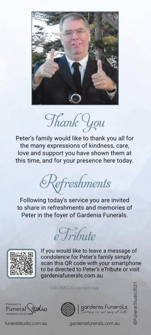 If you would like to leave a message of condolence for Peter ’ s family simply scan this QR code with your smartphone to be directed to Peter ’ s eTribute or visit gardeniafunerals . com . au