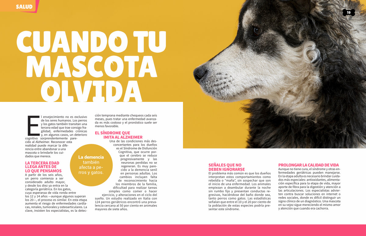 Una de las condiciones más desconcertantes para los dueños es el Síndrome de Disfunción Cognitiva, que ocurre porque el cerebro se reduce progresivamente y las neuronas perdidas no se regeneran. Es muy parecido a la demencia senil en personas adultas. Los cambios incluyen falta de reconocimiento hacia los miembros de la familia, dificultad para realizar tareas simples como comer o hacer ejercicio, y alteraciones en el ciclo del sueño. Un estudio realizado en Italia con 124 perros geriátricos encontró una prevalencia cercana al 50 por ciento en animales mayores de siete años.