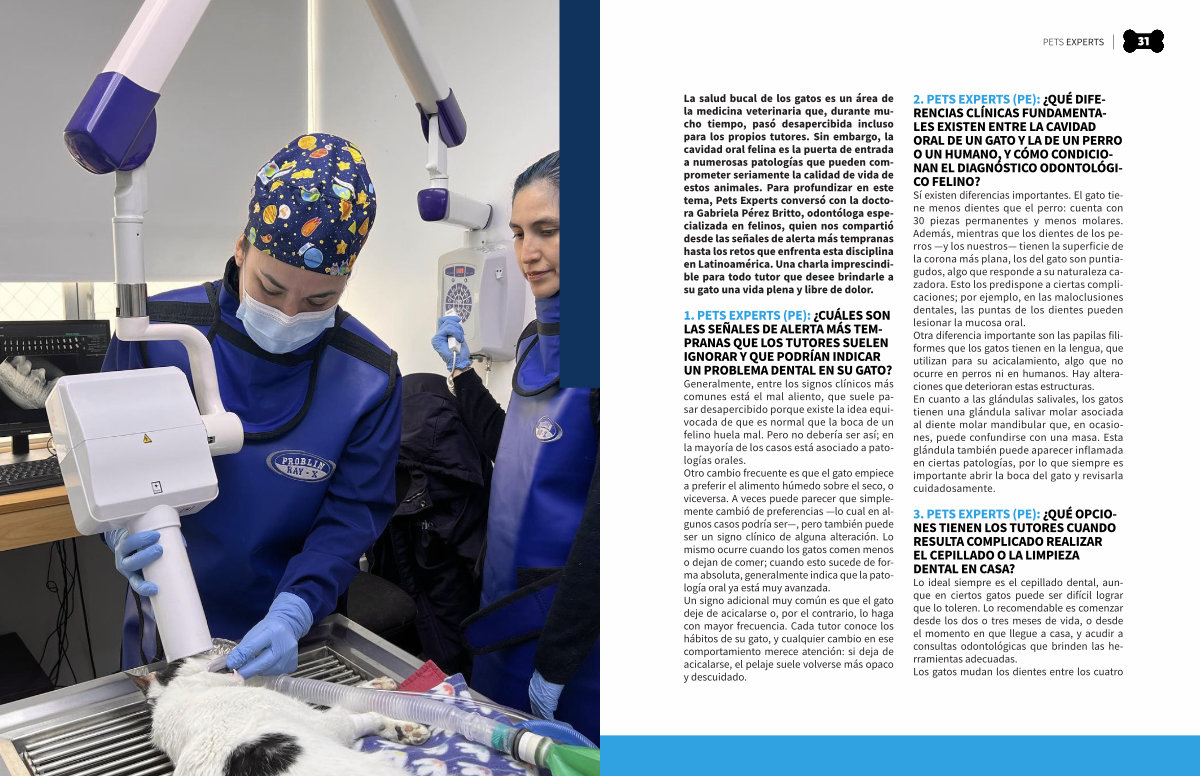 La salud bucal de los gatos es un área de la medicina veterinaria que, durante mucho tiempo, pasó desapercibida incluso para los propios tutores. Sin embargo, la cavidad oral felina es la puerta de entrada a numerosas patologías que pueden comprometer seriamente la calidad de vida de estos animales. Para profundizar en este tema, Pets Experts conversó con la doctora Gabriela Pérez Britto, odontóloga especializada en felinos, quien nos compartió desde las señales de alerta más tempranas hasta los retos que enfrenta esta disciplina en Latinoamérica. Una charla imprescindible para todo tutor que desee brindarle a su gato una vida plena y libre de dolor.