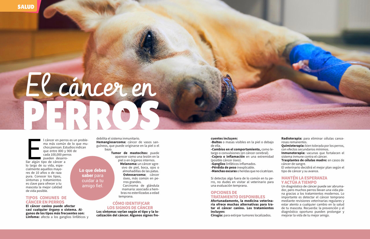 debilita el sistema inmunitario. Hemangiosarcoma: cáncer de vasos sanguíneos, que puede originarse en la piel o el bazo. Tumor de mastocitos: puede aparecer como una lesión en la piel o en órganos internos. Melanoma: un cáncer agresivo de piel, boca, ojos o almohadillas de las patas. Osteosarcoma: cáncer óseo, más común en perros grandes. Carcinoma de glándula mamaria: asociado a hembras no esterilizadas a edad temprana.