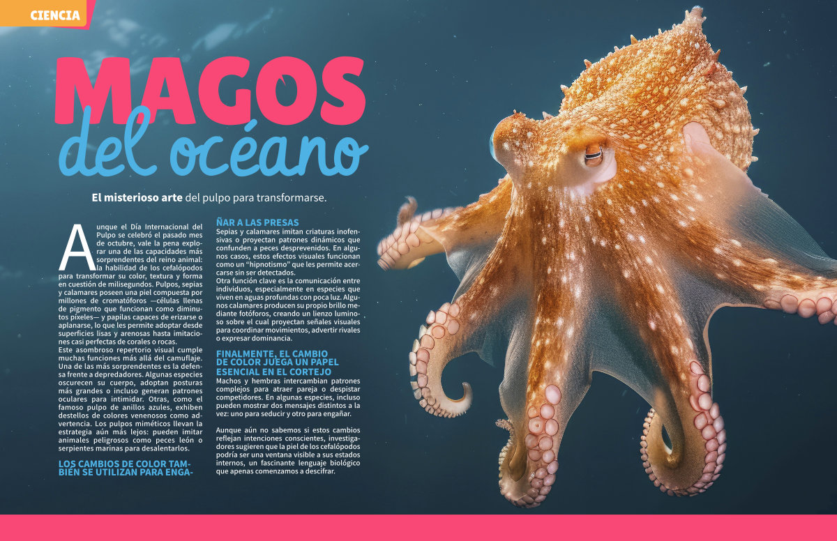 Aunque el Día Internacional del Pulpo se celebró el pasado mes de octubre, vale la pena explorar una de las capacidades más sorprendentes del reino animal: la habilidad de los cefalópodos para transformar su color, textura y forma en cuestión de milisegundos. Pulpos, sepias y calamares poseen una piel compuesta por millones de cromatóforos— células llenas de pigmento que funcionan como diminutos píxeles— y papilas capaces de erizarse o aplanarse, lo que les permite adoptar desde superficies lisas y arenosas hasta imitaciones casi perfectas de corales o rocas. Este asombroso repertorio visual cumple muchas funciones más allá del camuflaje. Una de las más sorprendentes es la defensa frente a depredadores. Algunas especies oscurecen su cuerpo, adoptan posturas más grandes o incluso generan patrones oculares para intimidar. Otras, como el famoso pulpo de anillos azules, exhiben destellos de colores venenosos como advertencia. Los pulpos miméticos llevan la estrategia aún más lejos: pueden imitar animales peligrosos como peces león o serpientes marinas para desalentarlos.