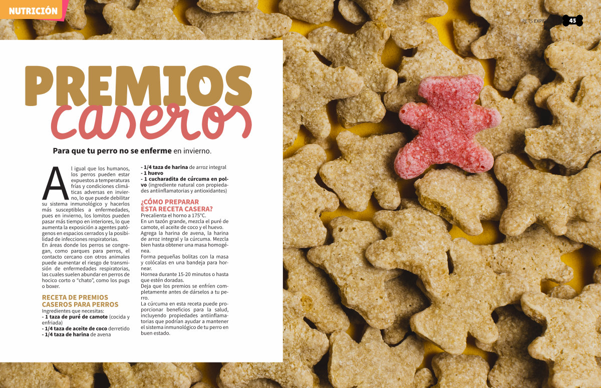 Precalienta el horno a 175 ° C. En un tazón grande, mezcla el puré de camote, el aceite de coco y el huevo. Agrega la harina de avena, la harina de arroz integral y la cúrcuma. Mezcla bien hasta obtener una masa homogénea. Forma pequeñas bolitas con la masa y colócalas en una bandeja para hornear. Hornea durante 15-20 minutos o hasta que estén doradas. Deja que los premios se enfríen completamente antes de dárselos a tu perro. La cúrcuma en esta receta puede proporcionar beneficios para la salud, incluyendo propiedades antiinflamatorias que podrían ayudar a mantener el sistema inmunológico de tu perro en buen estado.